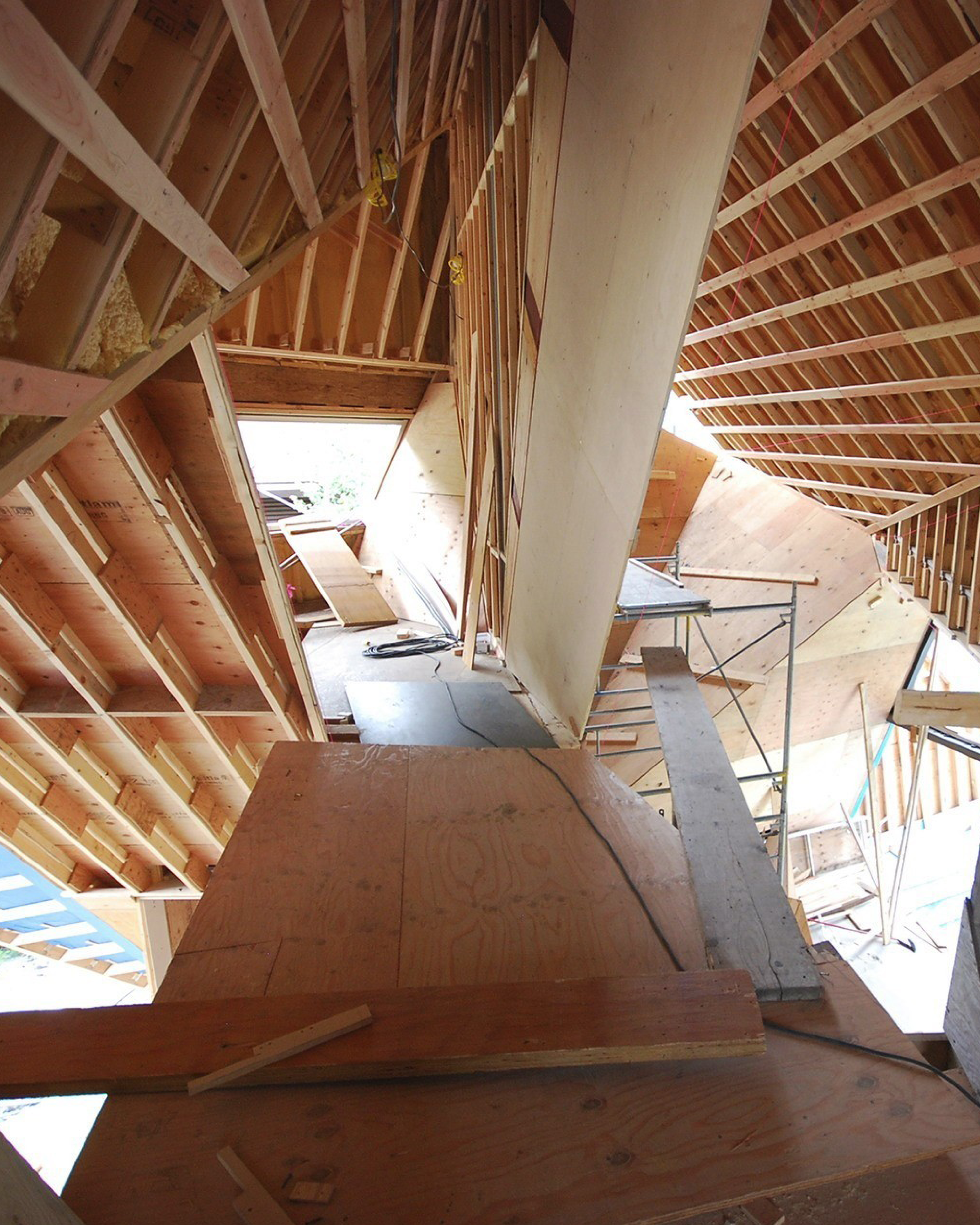 Le dialogue avec le propriétaire a introduit une autre particularité majeure, point de départ d'une expérience intérieure unique : l'exigence formelle de n'intégrer ni arrondis ni angles droits dans l'aménagement, allant jusqu'aux éléments pratiques comme les lavabos. Patkau a relevé ce défi en prolongeant la logique des volumes extérieurs. Ainsi, l'intérieur se déploie lui aussi à travers des plans dynamiques, créant un espace entièrement non-orthogonal où les volumes semblent s’être naturellement pliés, aux allures d'origami.